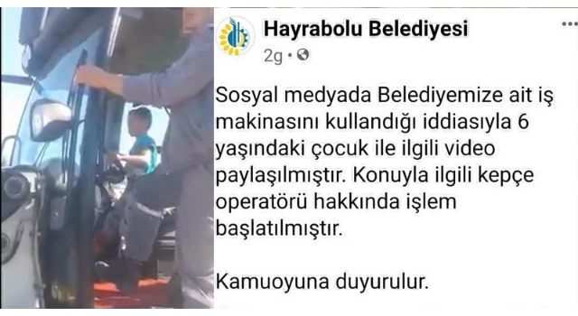 Tekirdağ'ın Hayrabolu ilçesinde, belediyeye ait iş makinesini 6 yaşındaki oğluna kullandıran operatör Tahir D. hakkında idari işlem başlatıldı.