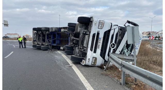 Tekirdağ'ın Ergene ilçesinde, virajı alamayarak bariyerlere çarpıp devrilen TIR'ın sürücüsü yaralandı.