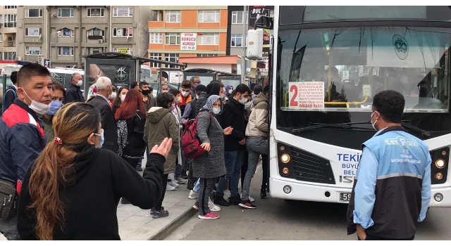 Tekirdağ'ın Çorlu ilçesinde sabah işe gitmek isteyen vatandaşlar, ayakta yolcu almanın yasaklanmasının ardından toplu taşıma araçlarını binmek için duraklarda yoğunluk oluşturuyor, sosyal mesafe kuralı ihlal ediliyor.