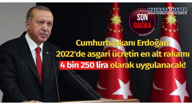 Cumhurbaşkanı Erdoğan, 2022 yılında asgari ücretin en alt rakamının 4 bin 250 lira olarak uygulanacağını, çalışanın evli olmasına ve çocuk sayısına göre rakam yükseleceğini açıkladı.