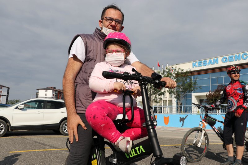 Edirne'nin Keşan ilçesinde 3 Haziran Dünya Bisiklet Günü kapsamında düzenlenen etkinliğe, aileler çocuklarıyla katıldı. Çok sayıda anne ve babanın bebek ve çocuklarını ise bisikletlerine aparatla bağlı olan pusetlerde taşımaları renkli görüntüler oluşturdu.