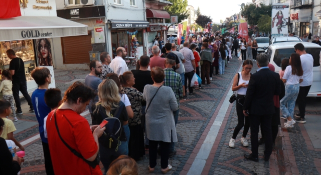 Yarışmaların ardından toplam 1 ton 100 gramlık bedava dağıtılan ekmek arası ciğer almak isteyen vatandaşlar izdihama neden oldu. Saraçlar Caddesi, PTT önünde başlayan kuyruk caddenin girişine kadar uzadı. Vatandaşlar ciğer alabilmek için yaklaşık 100 metre boyunca kuyruk oluşturup sıraya girdi. (DHA)