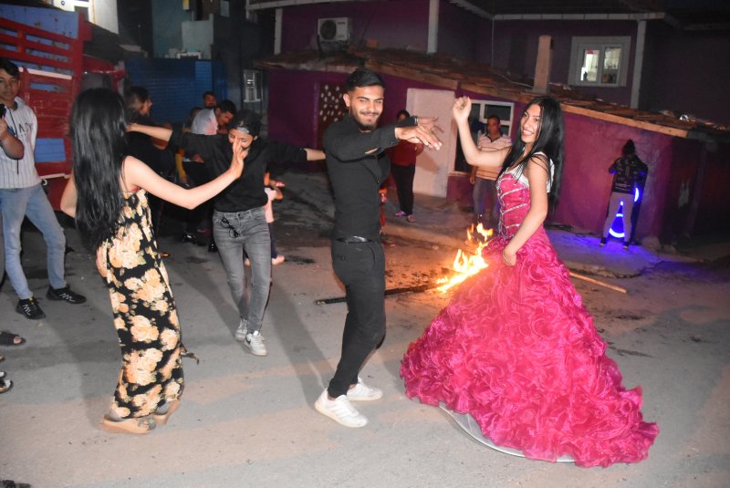 Sarayiçi’ne gidemeyen Romanlar, havanın kararmasıyla birlikte evlerinin önünde ateş yakarak Kakavayı kutladı. Menzirahır Mahallesi'nde kutlamalar yakılan ateşlerler başladı. Ateşin üzerinden dilek tutup atlayanlar, ardından çalınan Trakya’nın 9-8'lik havaları eşliğinde göbek atıp gönüllerince eğlendi. Genç kızların gelinlik giyerek ateşin etrafında göbek attığı gecede koronavirüs önlemlerinin de unutulduğu görüldü.