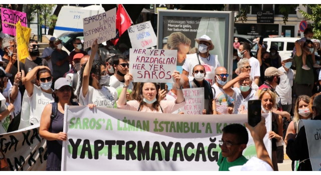 Edirne'nin Keşan ilçesine bağlı Sazlıdere ve Gökçetepe köyleri arasındaki Saros Körfezi kıyısına BOTAŞ tarafından yapılan Likit Doğal Gaz Taşıma Yükleme Limanı (FSRU) inşaatının durdurulması için ‘Saros’uma dokunma’ mitingi düzenlendi.