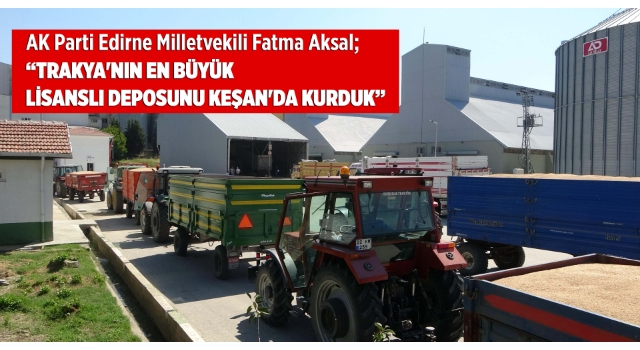 Milletvekili Fatma Aksal, Trakya'da devam eden buğday hasat sezonunun tüm üreticilere hayırlı olmasını dileyerek, "Trakya'nın en büyük lisanslı deposunu Keşan'da kurduk. Bu yıl itibariyle 90 bin ton kapasiteye sahip oldu. Tüm Türkiye'ye hitap eden bir depo. Ben lisanslı deponun gerekliliğine inananlardanım. Lisanslı deponun çok artıları var. Lisanslı deponun amacı üreticimizin ürünün bol olduğu dönemde ürününü satmak zorunda kalmaması. Lisanslı depo çok artı getiriyor. Biz üreticimizi tüccara muhtaç bırakmak istemedik. Bu yıl ürün bırakan üreticinin parasını aynı gün ya da 3 iş günü içerisinde ödüyoruz. Ama bizim amacımız üreticinin fiyat en yüksek olduğu dönemde ürününü satması’’ dedi.