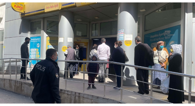 Polis ekipleri ve PTT görevlileri, kuyrukta bekleyenleri sıraya sokarak, sosyal mesafeye uymaları konusunda uyarıda bulundu.