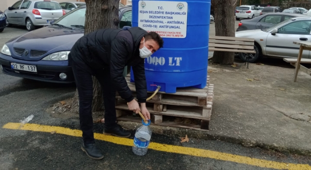 Keşan Belediye Başkanı Mustafa Helvacıoğlu, eski itfaiye binasında vatandaşa ücretsiz olarak dezenfektan dağıttıklarını belirterek, “Dezenfektan çeşmemiz burada. Tüm halkımızı buradan, dezenfektan çeşmemizden dezenfektan almaya davet ediyoruz. Sürekli maske, sosyal mesafe ve hijyene vurgu yapıyoruz.