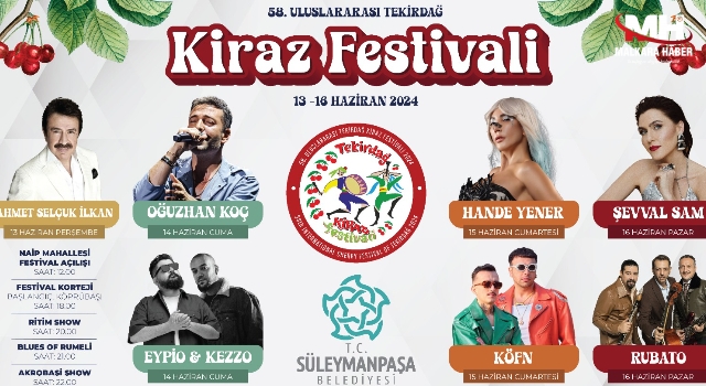 Süleymanpaşa Belediyesi tarafından 13-16 Haziran tarihleri arasında düzenlenecek 58. Uluslararası Tekirdağ Kiraz Festivali’ne katılacak sanatçılar belli oldu.