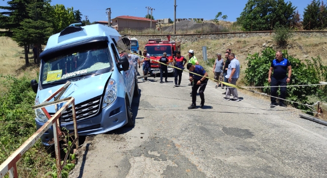 Köprü korkuluklarına çarpan minibüse dere yatağına düşmemesi için halatlı önlem