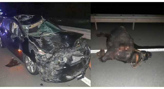 Edirne'nin Keşan ilçesinde, yolda başıboş gezen mandaya çarpan otomobil hurdaya dönerken, sürücü Ozan Ç.(35) ve araçta bulunan kızı Beril Ç.(2) yaralandı.