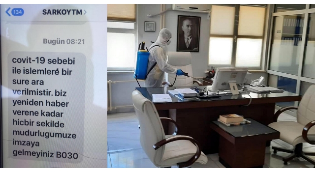 Müdürlükte işlemleri olan vatandaşlara cep telefonu ile gönderilen mesajda, "Covid-19 sebebi ile işlemlere bir süre ara verilmiştir. Biz yeniden haber verene kadar hiçbir şekilde müdürlüğümüze imzaya gelmeyiniz" denildi.