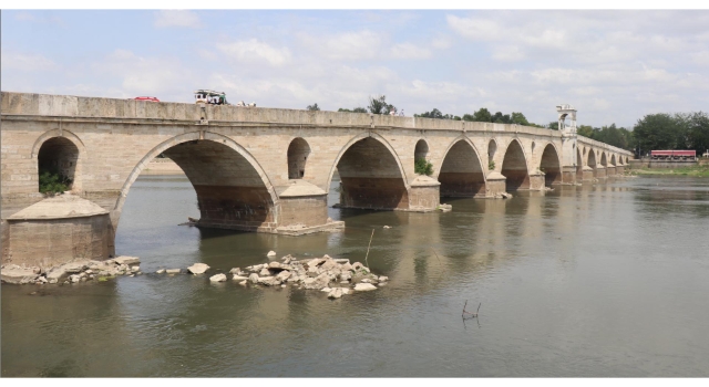 Edirne'de yaşanan kuraklık nedeniyle Meriç Nehri'nin debisi saatte 48 metreküp/saniyeye düşünce, tarihi Meriç Köprüsü'nün suya gömülü ayakları ortaya çıktı.