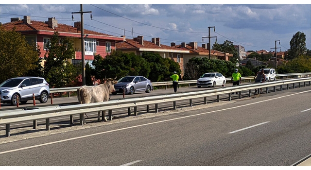 Edirne'nin Keşan ilçesinde, mezbahaya götürülmek için kamyona bindirilirken kaçan inek, 4 saatlik kovalamacayla yakalandı.