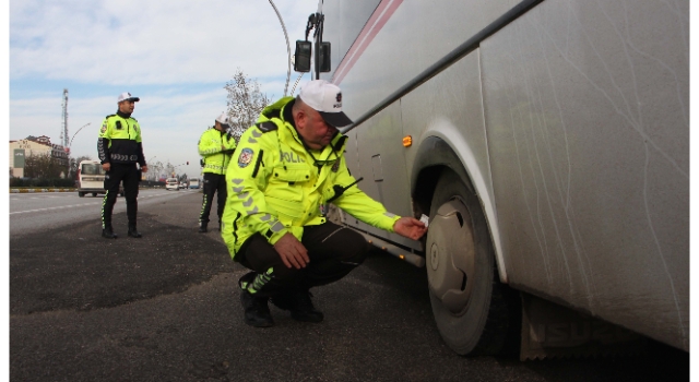 İl Emniyet Müdürlüğü Trafik Tescil ve Denetleme Şube Müdürlüğü ekipleri, kente girişindeki uygulama noktasında 1 Aralık itibarıyla şehir içi ve şehirler arası yolcu taşımacılığı yapan ticari araçlarda zorunlu olan kış lastiği denetimi yaptı.