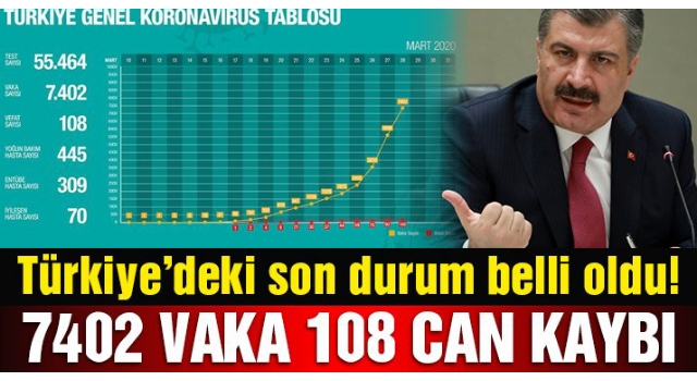 Sağlık Bakanı Fahrettin Koca corona virüsünde yeni verileri açıkladı. Koca'nın açıkladığı verilere göre, Türkiye'deki vaka sayısı 7 bin 402'ye yükseldi, can kaybı ise 108 oldu.