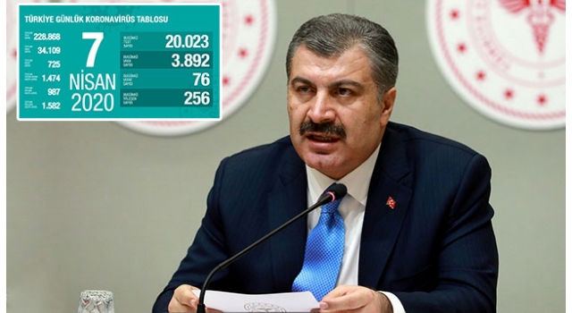 Bakan Fahrettin Koca, video konferans yöntemiyle yapılan Koronavirüs Bilim Kurulu toplantısının ardından basın açıklaması yaptı. 'Türkiye Günlük Koronavirüs Tablosu'nu açıklayan Bakan Koca, bugün yapılan 20 bin 23 koronavirüs testinden 3 bin 892'sinin pozitif çıktığını, 76 hastanın yaşamını yitirdiğini, 256 hastanın da iyileştiğini söyledi. Bakan Koca, toplam test sayısının 222 bin 868, toplam vaka sayısının 34 bin 109, toplam vefat sayısının 725, toplam yoğun bakım hasta sayısının bin 474, toplam entübe sayısının 987, toplam iyileşen hasta sayısının bin 582 olduğunu bildirdi.