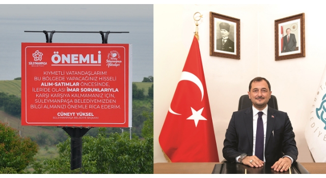 “Kıymetli vatandaşlarım, bu bölgede yapacağınız hisseli alım-satımlar öncesinde, ileride olası imar sorunlarıyla karşı karşıya kalmamanız için Süleymanpaşa Belediyemizden bilgi almanızı önemle rica ederim.”