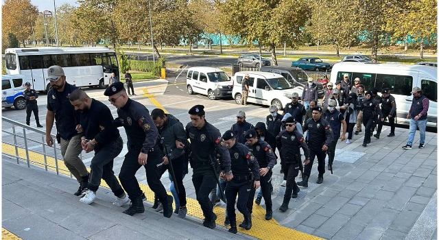 Şüphelilerden emniyette işlemleri tamamlanan 9'u, bugün sıkı güvenlik önlemleri altında adliyeye sevk edildi. (DHA)