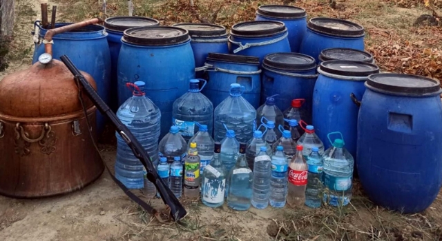 Evde arama yapan jandarma ekipleri, 2 ton 230 kilogram şarap, 264 litre rakı, damıtma düzeneği ile 1 ruhsatsız tabanca ele geçirdi.