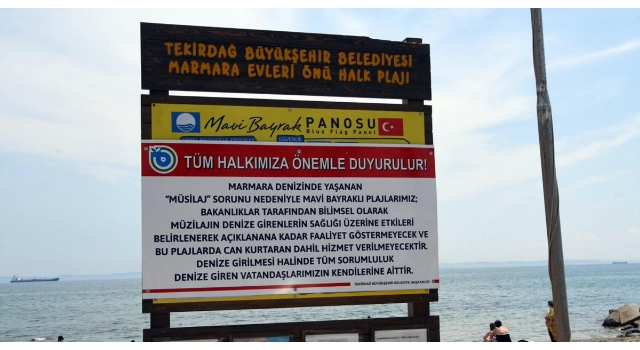 Marmara Denizi'ni aylardır etkisi altına alan müsilajla ilgili Çevre ve Şehircilik Bakanlığı'nca 'Marmara Denizi Eylem Planı'nı kapsamında temizlik çalışması sürüyor. Tekirdağ Büyükşehir Belediye Başkanlığı, il genelinde bulunan mavi bayraklı plajdaki faaliyetlerini müsilaj nedeniyle halkın sağlığını gerekçe göstererek durdurdu. Şarköy ilçesinde bulunan mavi bayraklı 6 plaja belediye tarafından "Tüm halkımıza önemle duyurulur' başlığını taşıyan levhalar asılarak denize girmemeleri yönünde uyarı levhaları asıldı. Levhalarda, "Marmara Denizi'nde yaşanan müsilaj sorunu nedeniyle mavi bayraklı plajlarımız; bakanlıklar tarafından bilimsel olarak müsilajın denize girenlerin sağlığı üzerine etkileri belirlenerek açıklanan kadar faaliyet göstermeyecek ve bu plajlarda can kurtaran dahil hizmet verilmeyecektir. Denize girilmesi halinde tüm sorumluluk denize giren vatandaşlarımızın kendilerine aittir" yazısı yer aldı.