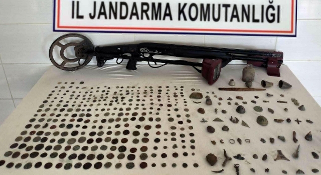 Şüphelinin ev ve aracında yapılan aramalarda, tarihi eser niteliği taşıyan 312 sikke, 76 obje, 1 dedektör, 1 ruhsatsız av tüfeği ele geçirildi.