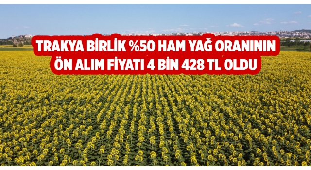 TRAKYA Yağlı Tohumlar Tarım Satış Kooperatifleri Birliği (Trakya Birlik) Yönetim Kurulu, ön alım fiyatını yüzde 40 oranlı ayçiçeği için 3 bin 850 TL/Ton olarak belirlediklerini bildirdi.