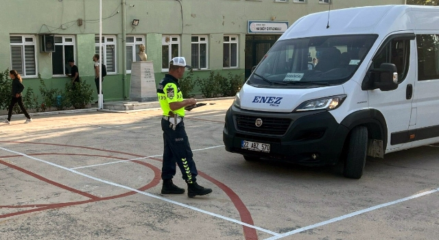 Denetimlerde servis sürücülerine kurallar hatırlatılırken, öğrenciler de temel trafik konuları hakkında bilgilendirildi.