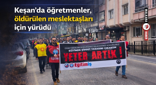Edirne'nin Keşan ilçesinde öğretmenler, İstanbul'un Çekmeköy ilçesindeki bir lisede görev yapan meslektaşları Fatma Nur Çelik'in (44), öğrencisi F.S.B. (17) tarafından bıçaklanarak öldürülmesini protesto etmek için bir günlük iş bırakarak, yürüdü.